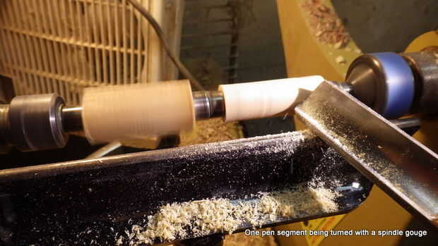 Verificar una vez más que los espacios en blanco de la pluma estén colocados correctamente y que los bujes en los puntos. Asegúrese de que el contrapunto es asegurar el mandril correctamente y que los espacios en blanco de la pluma son firmemente en lugar. Poner el resto de la herramienta en posición paralela y cerca del blanco de la pluma. Ajustar la altura del soporte de la herramienta para que el filo de la herramienta será en el centro de la madera de spinning. Gire a la un revolución mandril con la mano para asegurarse de que la madera no tenga contacto con el soporte de la herramienta antes de encender el torno.