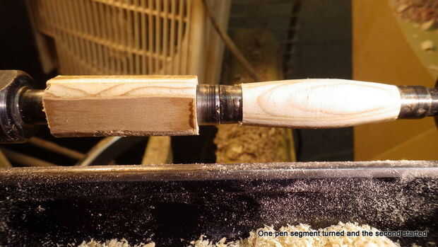 El primer paso en la conformación de las porciones superiores e inferiores de la pluma es quitar las esquinas de la madera y convertirlos en cilindros. En la primera foto que hice el pen parte inferior en un cilindro. Una vez que la madera es completamente redonda (no puntos planos) comienzan a dar forma a la madera sus deseos. El objetivo final es aceptar los espacios en blanco para ser del mismo diámetro que los bujes. Yo estoy dando vueltas a esta pluma para que una curva convexa en él para mejorar la visibilidad de las capas de madera contrachapada. El punto alto de la curva está en el centro de los espacios en blanco de la pluma inferior y superior. La segunda foto se toma con el torno parado y se puede ver que he quitado las esquinas de la pluma superior y crea la curva de la parte inferior de la pluma. También tenga en cuenta que la madera de la pluma inferior es el mismo diámetro que los bujes.