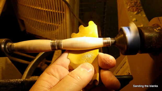 Aflojé el torno hasta unos 700 RPM antes de lijar. Se debe seleccionar la lija más fina que eliminará cualquier marca de herramientas de la madera. Ver la madera como arena para cualquier claro u oscuras puntos/líneas que puede indicar una marca de herramienta. Arena hasta que estas estas marcas se han ido y la superficie es lisa. Dejo el torno y arena con el grano al convertir un espacio en blanco de madera sólida y limpiar con mi mano o un trapo para deshacerse de cualquier suelta arenilla que podría han zafado del papel antes de pasar al siguiente mayor grano. Tratar de lijar la madera y para mantener el papel de la arena de los bujes. Lijar los bujes se reduce el diámetro de los casquillos y tienen que reemplazarse más temprano que tarde. Una segunda razón es el papel de la arena "recogerá" el metal de los cojinetes y cuando entra en contacto con la madera puede causar manchas oscuras de forma especialmente en maderas de color claro, las escamas de metal se frotan sobre la superficie de madera.