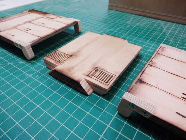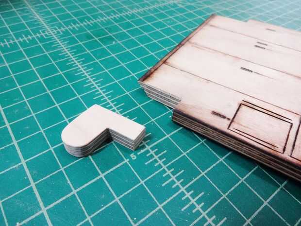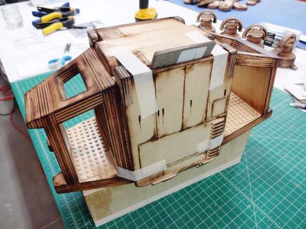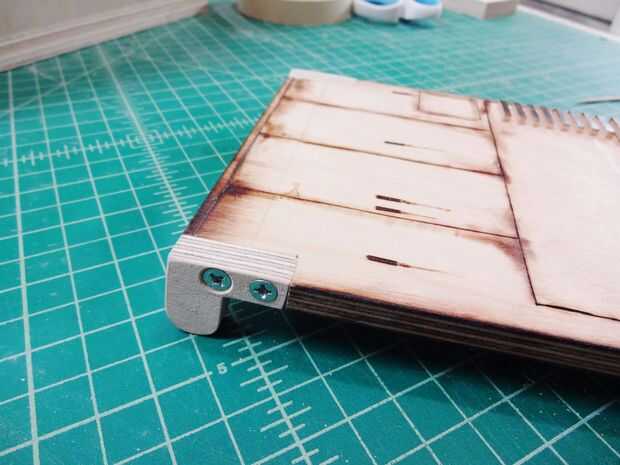 Para colocar las puertas de acceso principal, tuve que modificarlos y crear unas bisagras de madera incorporadas. Éstos eran pegados y atornillados en su lugar y entonces acabados para que coincida con el resto de las piezas.