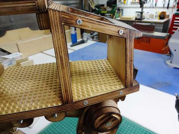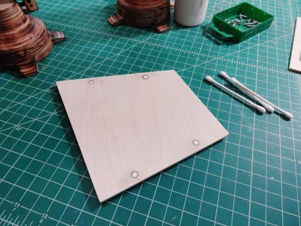 Hice las cuatro paredes restantes del cuerpo de madera contrachapada de 3mm. Imanes de neodimio pequeños se ajustaron en los agujeros agujereados-hacia fuera, que se alinearán con los tornillos colocados en el chasis.