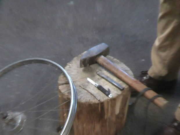 Como herramientas necesitas un martillo, una piedra de afilar o un archivo, un cuchillo o scissers y un cincel. Puede usar un martillo como yunque. Cualquier martillo está bien. En lugar de una piedra de afilar, puede moler el rayo en el piso de cemento o en una piedra del río. Como materiales se necesita un rayo de bicicleta una tira de goma de un neumático de coche interior.