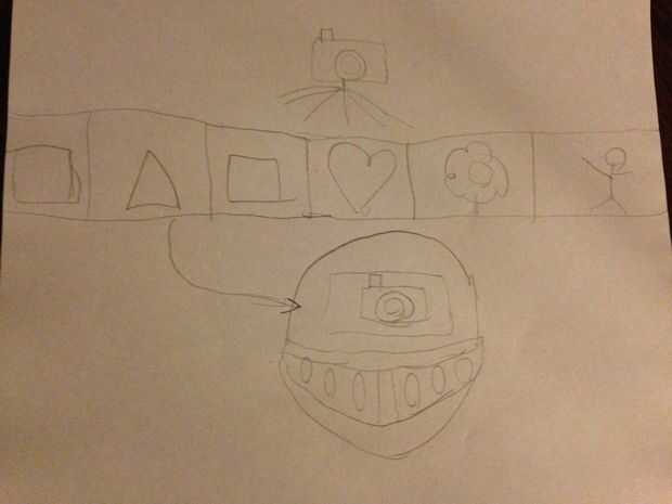Un schetch de un casco como máquina del tiempo con algunos haga clic en tipo de mecanismo, por lo que los estudiantes pueden mirar a través de varios cuadros históricos. De esta forma pueden experimentar el contenido histórico de una mejor manera.