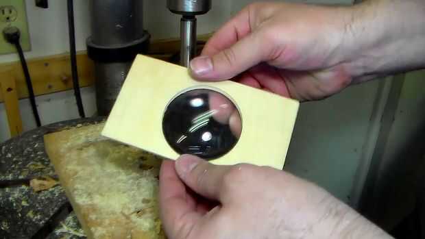 La lente frontal fue aproximadamente 2 3/8" de diámetro. Sólo sé que porque ese es el pedacito de forstner tamaño solía hacer el agujero, y fue casi perfecto.