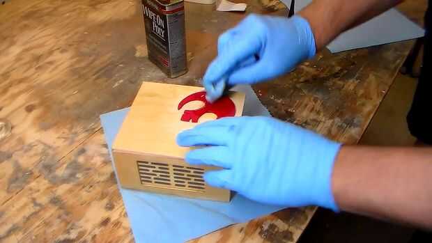 Al día siguiente, cuando el pegamento ha secado, añadí el símbolo superior con algún pegamento y dio todo el proyecto de una capa de poliuretano para protección.