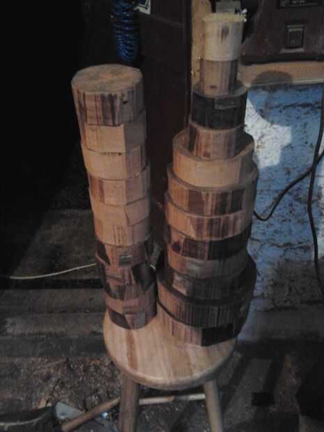 El corte fue hecho con una sierra de banda con una cuchilla 6tpi equipada, el corte me llevó toda la noche y la hoja es ahora solo cortar madera y pino tableros, pero tengo 24 bol los espacios en blanco de diferentes tamaños que me tenga ocupado durante un buen rato. Esta madera es tan fuerte como el hierro y la banda la sierra estaba luchando a veces cortar algunas piezas como la dirección del gran cambió como las curvas que cortan, los espacios en blanco no necesitan ser círculos perfectos pero trata y hacerlos lo mejor posible.