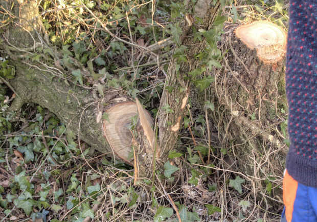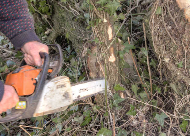La motosierra se utiliza para hacer un oblicuo agudo o Linda a un lado de la joven para crear una bisagra pequeña como se muestra en la foto. El árbol ahora está en ángulo cuidadosamente en esto con bisagras y colocan acostadas en el seto. Es importante tener en cuenta que el corte agudo se hace directamente opuesta a la dirección que desee el árbol a establecerse.