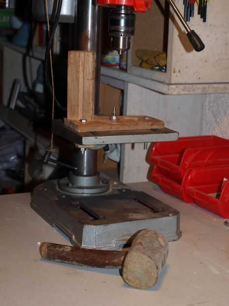 Este es un bloque vertical de madera 12 cm x 5 cm x 1.5 cm firmemente atornillados y pegados en la base. Sirve para deslizar la herramienta hacia arriba y hacia abajo por el borde de la pieza de trabajo. Además protege la mano de llegar a cerca de la pieza de giro. La longitud depende del espacio disponible que tienes en el taladro. Retrospectivamente debo han hecho esta unos centímetros más de largo.