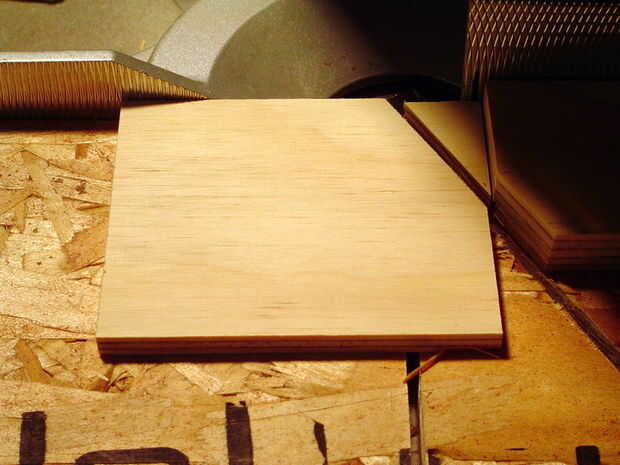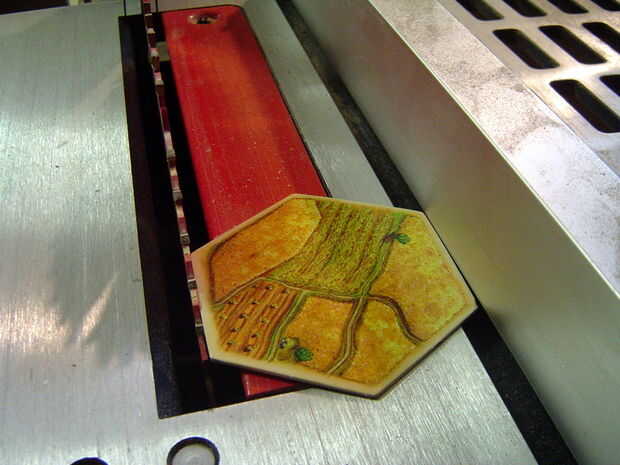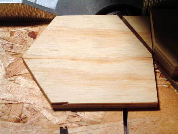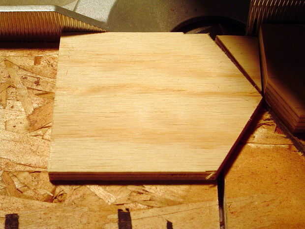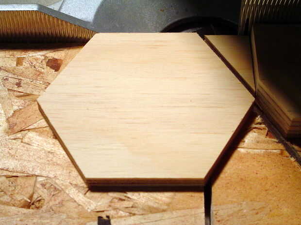 Primero, se corta la madera contrachapada cualquier hexágono ancho que desee. Hice mío 84 mm, ligeramente más grande que el azulejo estándar de Catan . La tira de madera contrachapada y necesita cortar a longitudes 2/sqrt3 más largo que el ancho, es decir, 1.1547 x más de largo, por lo que terminaron mi rectángulos hasta 84 x 97 mm. corte en una parada, que puede sujetarse a la cerca. Cortar las piezas por lo menos 19.