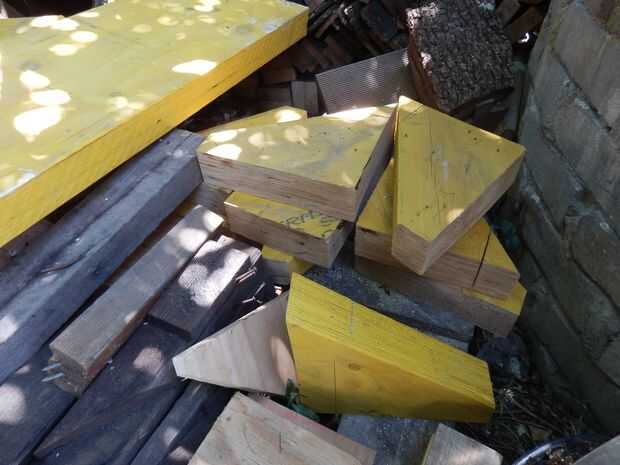 El contrachapado estructural objeto de dumping es principalmente cortes. Sospecho fue utilizado para la fabricación de escaleras, por este motivo hay muchos triángulos y otras formas impares. Para este proyecto utilicé una de las piezas más pequeñas.