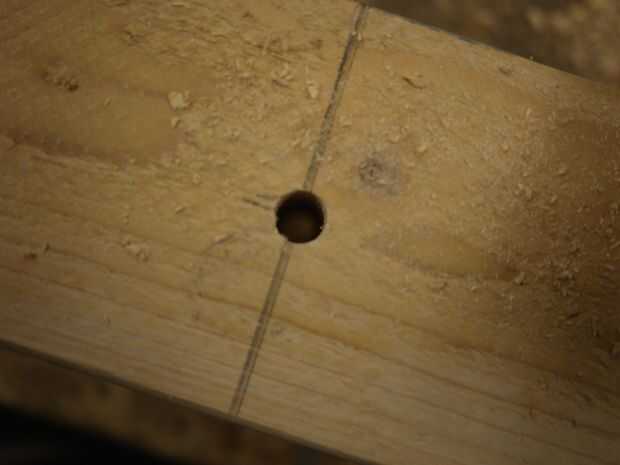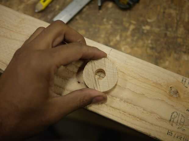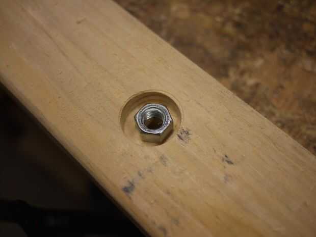 7. Luego usé un forstner de 1,5 pulgadas de bits para hacer un agujeros de 3/4 pulgada de profundidad dejó en la cara exterior de cada tablero. Esto es una llave apretar tuercas y tornillos debajo de la superficie de la madera. Este paso es opcional, sólo quería mi hardware para ser enterrado.
