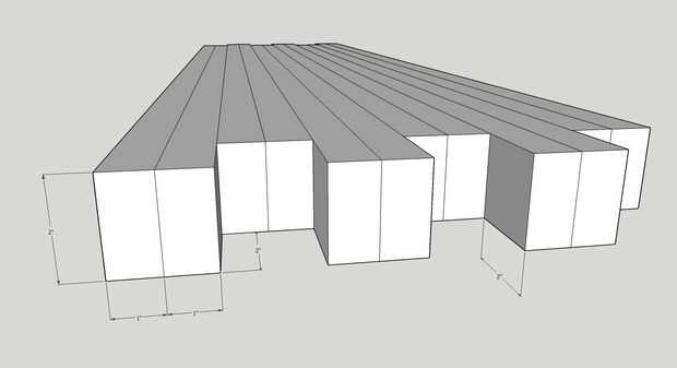 — Tomar 12 tablones de 43 "x 2" y ellos en borde, los escalonando de dos en dos, como se muestra en la imagen. El desplazamiento de cada lado será 2" de profundidad; el ancho total de la banca será 12"(12 tablones, cada 1" amplia).