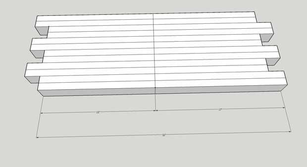 Para obtener un corte cuadrado, esto debe hacerse con una sierra de mesa con un trineo. Si no tienes acceso a un trineo, puede ser mejor cortar los tablones individuales a la medida antes de pegar las losas: en lugar de 48 tablas de 32", usted cortará 48 tablones de 17" y 48 tablones de 15", luego pegamento en 8 losas — plana en un extremo, irregulares en el otro — de 17" x 12" x 2. (Ver paso siguiente para la foto)