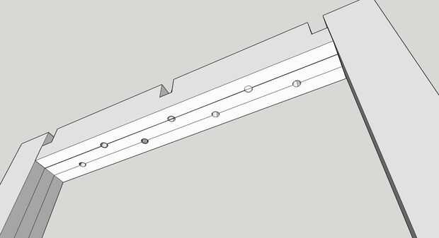 Haga agujeros en la viga superior de cada cuadrado para 6 o más tornillos, como se muestra (la superior beam—i.e que irá directamente debajo de la mesa es la viga con las mortajas)