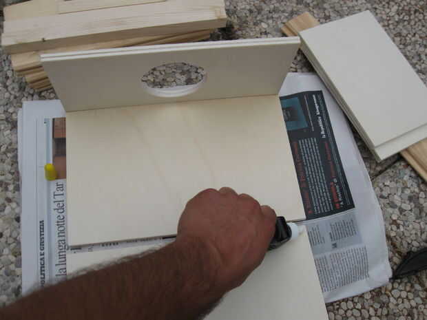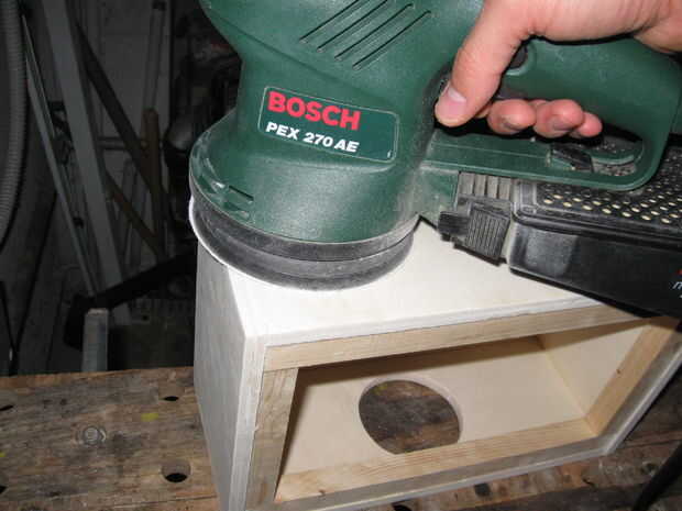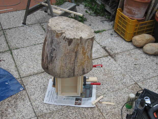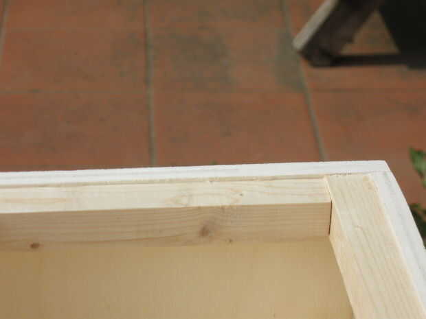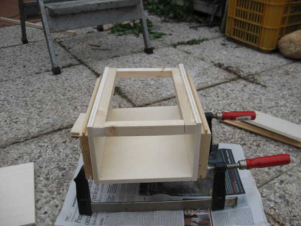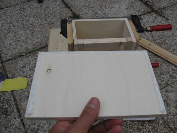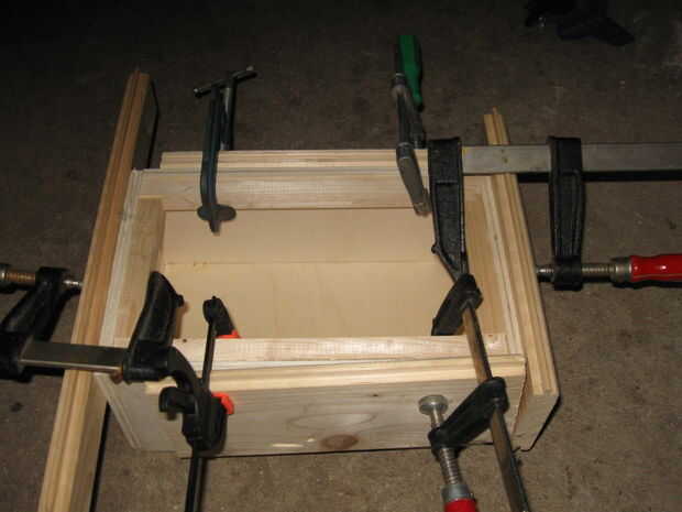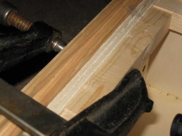 reuní la caja con pegamento y las abrazaderas durante el secado. Al pegar el marco interno de los 4 palos de pino es importante para asegurarse de que es no al ras con la parte superior de los laterales de la caja (ver foto), para 1) permitir suficiente espacio para la cadena de guitarra 2) permite la cara bofetada a vibrar más cuando se toca.