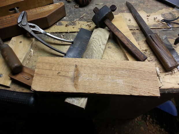 No tengo un banco de madera regular con perros de banco o prensas de extremo para atornillar dos piezas de madera contrachapada en un ángulo y utiliza pedazos de desecho como cuñas para mantener la pieza en su lugar. Debido a la dirección de la cuña la pieza de trabajo permanece puesto que trabajo en él. Para quitarlo simplemente tírelo hacia mí y va a venir derecho hacia fuera. Este es un buen truco si no tienes otra forma de sujeción y no importa agujeros en le Banco. Sin embargo, esto no funcionó para la hoja porque es más delgado que las cuñas. Pude ha hecho un set de ganchos de banco, pero fue la manera rápida y utilizar mi cepillo de caja. Con las caras de la hoja y el mango plano recortado la Plaza de los bordes de ambas piezas con la tabla VI. Un tablero de tiro podría has utilizado en lugar de eso. Ahora vamos a marcar la carpintería.