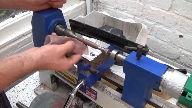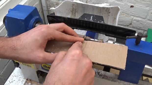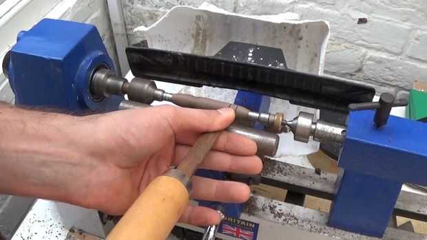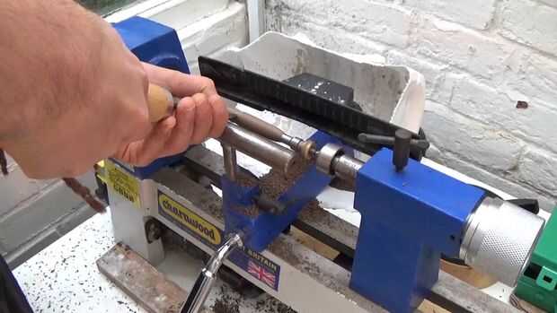 Montar el espacio en blanco en un mandril de pluma. Ir a trabajar con una gubia desbastar y empezar a formar el mango de la maquinilla de afeitar.