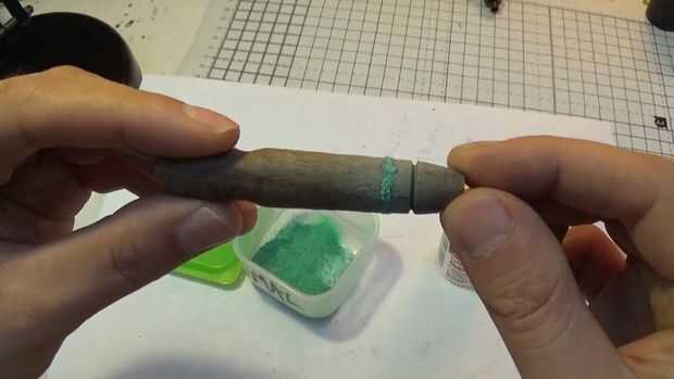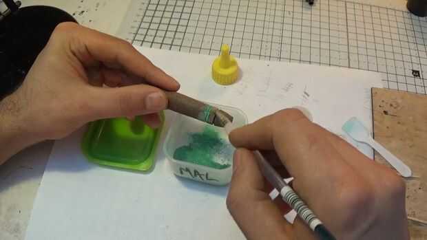 Con el corte de embutidos es hora de empezar a configurar la piedra. Aquí estoy usando un adhesivo de viscosidad media CA y Malaquita finamente picado.