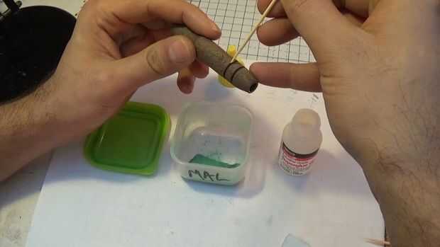 Cuidadosamente se aplican unas gotas del pegamento CA en la ranura utilizando un palito de cocktail. Tratar de evitar derrames y haz tanto como puedas en el hueco.