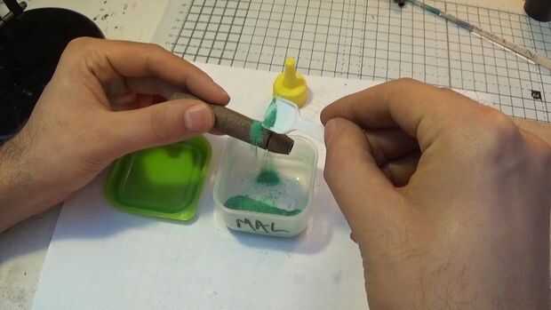 Mientras el pegamento está todavía mojado verter algunos del polvo. Espere hasta que se cure y luego eliminar el exceso.