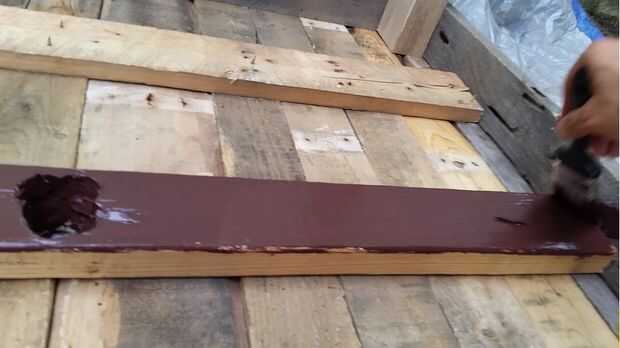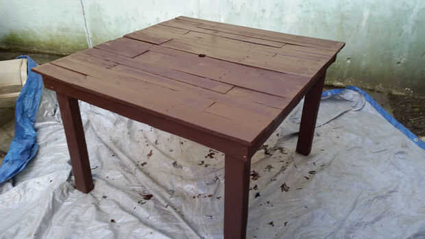 Después de taladrar el agujero, colocó una vieja lona de plástico en el suelo, volcó la mesa y comenzó a pintar desde el centro de la tabla a los bordes. Una vez que se completó la superficie plana, pasé a las piernas. Esperé unos minutos para las piernas para secarlo, luego he hojeado la mesa patas arriba y continuó pintando. Deje que se seque completamente antes de intentar moverlo.