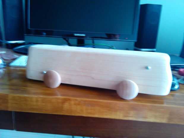 Una vez yo estaba contento con la forma utilicé la vista lateral impresa para colocar las ruedas. Como el original tiene sus ruedas por debajo (como un tren típico) tomé algunos "licencia artística" y coloca las ruedas en el exterior no sólo para facilitar el hacer sino también para hacer el juguete más estable en las manos de un niño de 16 meses de edad. He perforado los agujeros para los ejes de espiga y perforar orificios en los tiradores y ajuste seco todo lo posible para asegurarse de que en...
