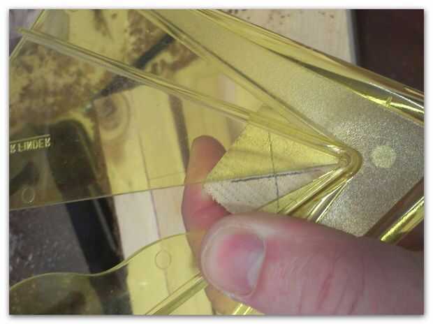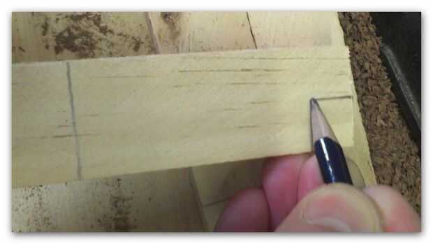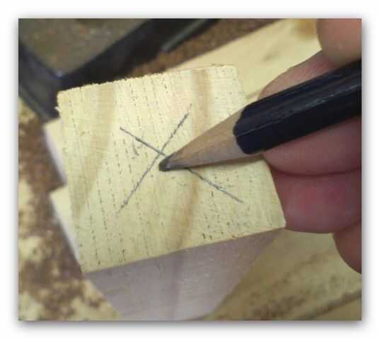 Hacer una línea en cada pieza de madera en un lugar donde usted quiere poner un enchufe, y luego marque el centro de la línea y utilizar un golpe para definir el punto de cruce (hacer esto en los extremos, así)