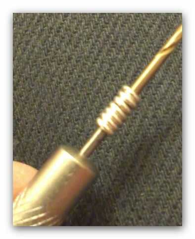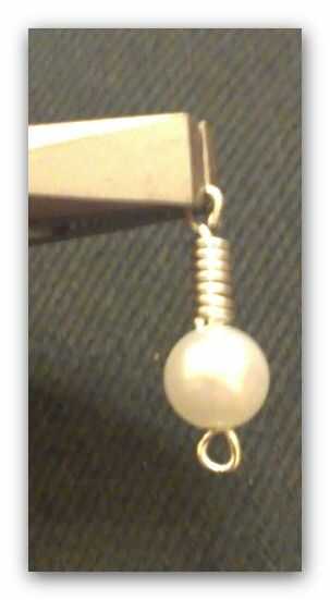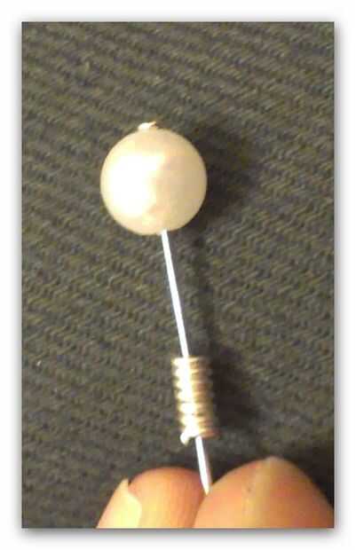 Para hacer el resorte que utilicé una de 1,5 mm brill del pedacito en un vicio de pin y envuelve un poco de alambre de plata 7 veces alrededor de él y había cortado los extremos. Entonces usé alicates de punta larga para cerrar los huecos en las vueltas. Un lazo se formó en otro pedacito de alambre y el grano y primavera se deslizó antes de un segundo bucle en el extremo superior.