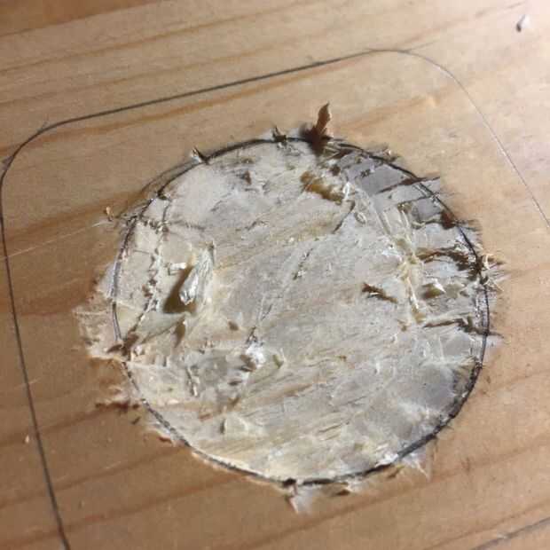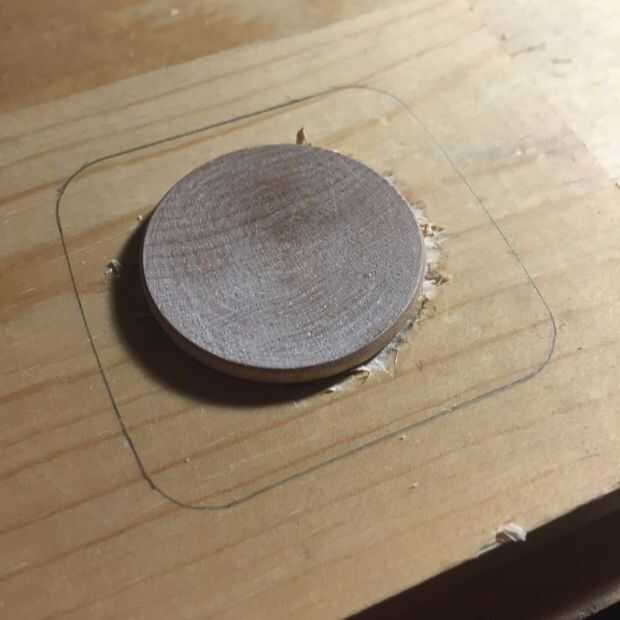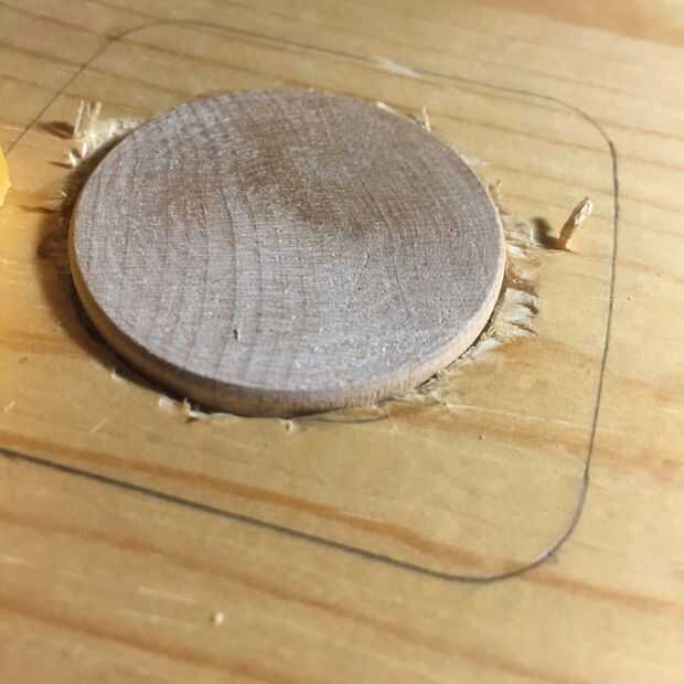 Coloque el disco en el hueco que apenas has labrado. Si no quedar completamente plano, utilice el lápiz para marcar los lugares donde el disco golpea el borde del agujero. Utilice su cuchillo de cincel y de utilidad para limpiar alrededor de los bordes hasta que el disco se encuentra en el agujero. El agujero no es necesario ser lo suficientemente profundo para que el disco quede al ras con la superficie, lo suficiente como para mantener el disco en su lugar.