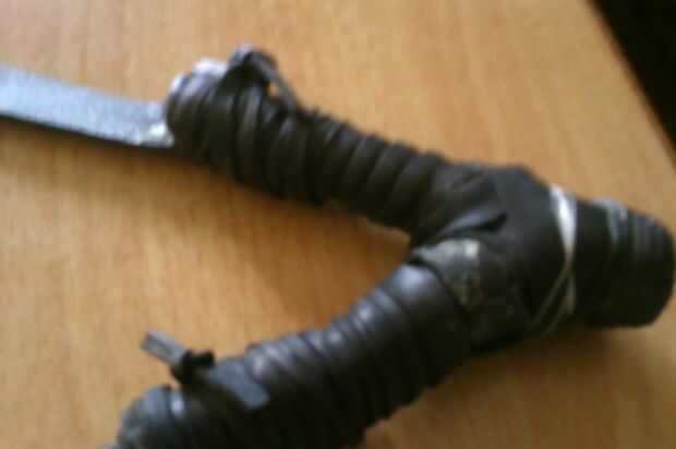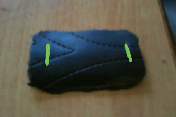 Corte un pedazo de cuero, lo suficientemente grande para cubrir tu palm. Hacer dos secciones pequeñas cerca del final de ese trozo de cuero.