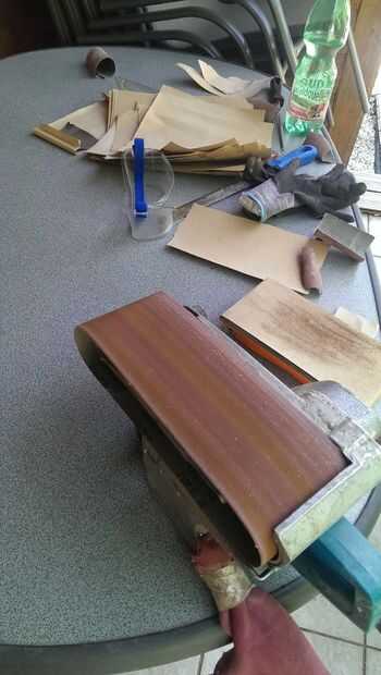 Para un esquema fuerte he utilizado la lijadora. Si está trabajando con una herramienta similar, será mejor utilizar unos guantes de seguridad, porque de lo contrario podría arena de algunos pedacitos de los dedos, debido al tamaño de la hoja.