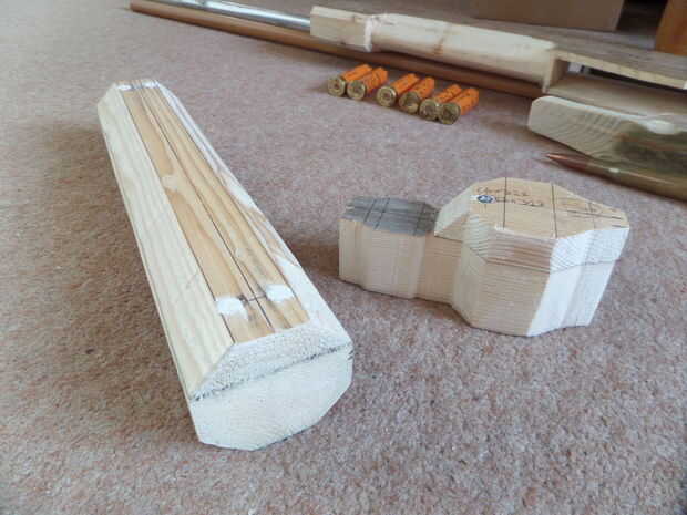 La cubierta del barril join tenía dimensiones exceda el ancho de 45mm que estaba usando para la mayoría de las piezas, así que pegué algunos madera gruesa de 20 m m para alcanzar la necesaria 65mm y les presentó después de esperar la cola para madera fijar. El freno de boca también excede la dimensión mínima de 45mm, pero tenía un 95 x 95 mm puesto que corté un pedazo de en su lugar. Si tienes madera con dimensiones más grandes usted puede cortar a medida para cualquiera de estas piezas.