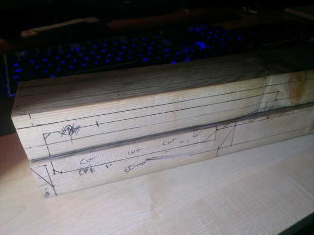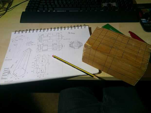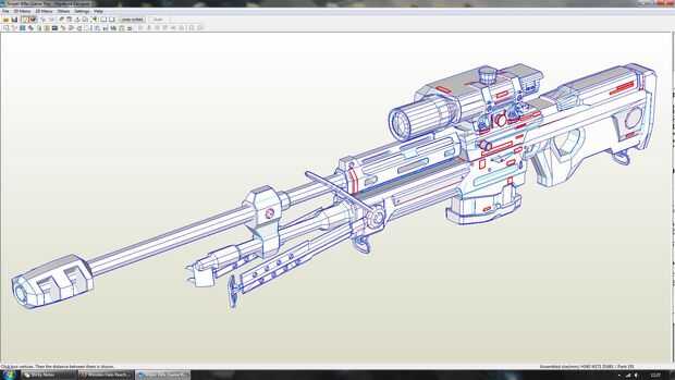 Para medir las dimensiones de cada sección y determinar las posiciones de cada función de superficie en relación con el borde de cada bloque de madera, descargué un archivo PDO del rifle y abrió en Pepakura Designer, donde podría utilizar la herramienta "Medir la distancia entre dos puntos" para bosquejar hacia fuera algunos planos ásperas.