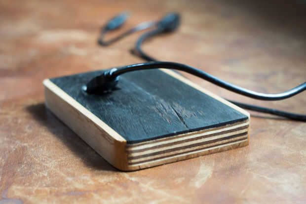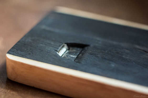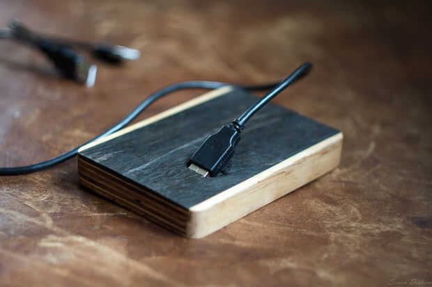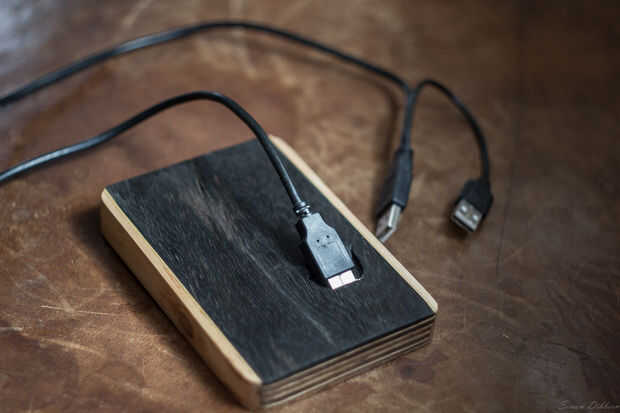 Para la electrónica utiliza una "SATA a USB"-board puede encontrar por unos cuantos dólares. El conector USB en esa placa fue quitado y un corto cable de usb con un conector hembra soldado en su lugar. Esto me permitió colocar el conector en esta posición algo inusual. El disco duro está rodeado por hojas delgadas de espuma, con el fin de absorber los choques y también mantenerlo en su lugar. Además, la espuma aísla la electrónica discos, que de otra manera podría ponerme en contacto con la madera.