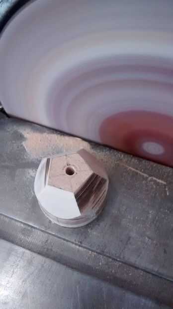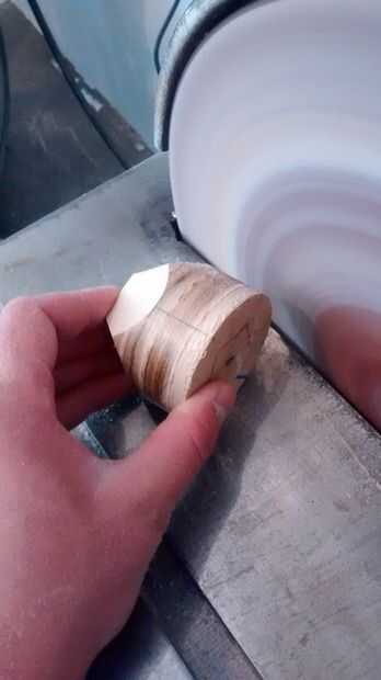 - Ahora, aquí viene la parte difícil. Usando una lijadora de disco con papel de lija de malla 60, pulir el borde de cada uno de los lados del Pentágono y la línea media del cilindro. Trate de asegurarse de obtener un plano entre la línea media y cada lado del Pentágono. Hacer esto para cada uno de los lados. Foto 2 muestra este proceso la mitad completa y Foto 3 aparece mi partida hacia el otro lado. Se puede ver en la foto 3 que alineó el borde del Pentágono por el ojo y comenzó a enarenar - corrección si necesitaba.