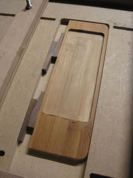 - Ajuste las guías para que se rebaje un área rectangular en el centro: esta área debe medir 130 mm * 62 mm y 4,5 mm de profundidad. Recuerde que siempre puede hacer este recorte más amplia y profunda, pero nunca al revés. Así que usted puede comenzar en el lado seguro, trate con el teléfono a continuación, ajustar...