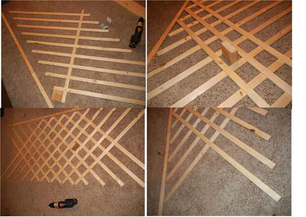 Gancho agarrador el asimiento de la pieza principal de la madera que tiene 9 otras piezas que se le atribuye. Cuidadosamente voltee su enrejado. Si algunas de las piezas giran te se necesitan ajustar nuevamente a los ángulos correctos de la derecha. Colocar las 8 piezas de madera necesarias para que ambos lados de la rejilla tienen 9 piezas complementarias. Mantener las separaciones en 3.5". Usted sabrá si haces esto correctamente si están produciendo formas cuadradas de 3.5" en el diseño de enrejado.