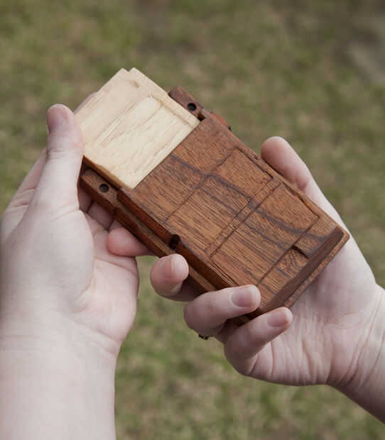 Sugerencias: Nogal, arce u otra madera ligera para el cartucho; caoba para el bolsillo de muchacho del juego.