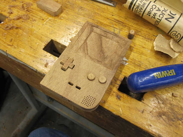 b) utilizando un lápiz, marca las áreas para el juego etiqueta y el logo de Nintendo. Atentamente les tallar hacia fuera con un cincel de mano. Limpio, bordes rectos, utilice el borde del cincel y tallar hacia abajo en la línea de lápiz. Recuerde siempre cincel con la veta de la madera.
