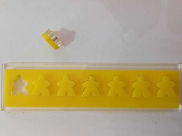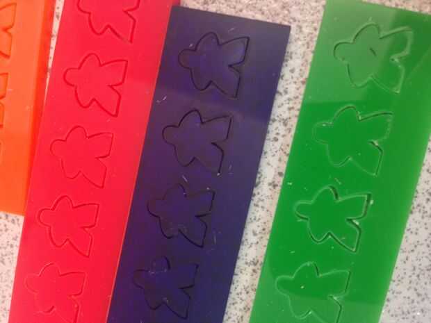 una vez había cortar de acrílico de 3 mm me di cuenta de que tenían que ser ligeramente más grueso para que puedan resistir, por lo que entonces yo cortar suficiente meeple claro a cada contador para darles el grosor.
