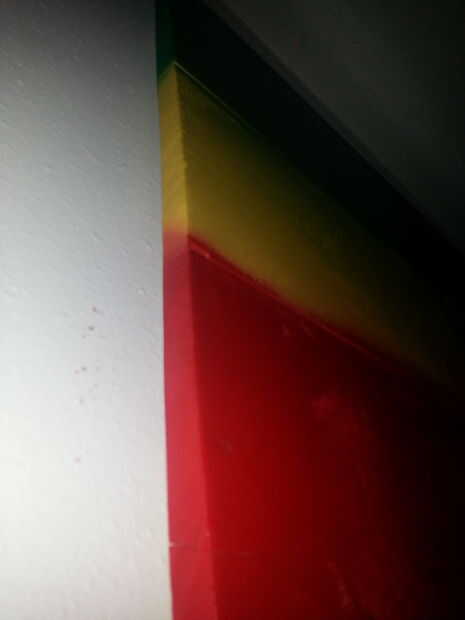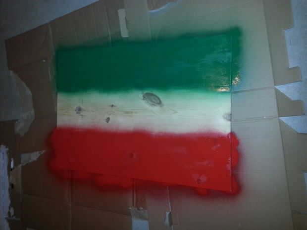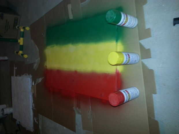 Una vez que el pegamento se haya secado y su lijado listo es hora de empezar a pintar. Usé pintura en spray para pintar esto. Añadí dos capas de pintura de cada color. Si desea que la línea sea perfectamente recta podría utilizar cinta de pintor para que allí recto. I encima traslapado los colores que el rojo y el verde cubrirá sobre el amarillo. No se olvide de pintar también los bordes. Mantenga la lata en posición vertical y el nivel para que el rocío viene salidas uniformemente. Esto también podría ser pintado con un pincel y pintura que llego a tener que pintar para que lo utilicé. También podría hacer una plantilla de una imagen y la pintura en el arte. Deje la pintura secar y colgar en la pared.