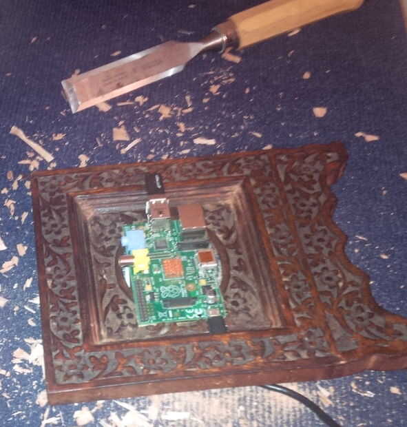 Primero puse el Pi en el marco y trazó los bordes exteriores con un lápiz. Quería que la placa de circuito para quedar al ras con la parte más baja de los ornamentos. Utilizando diferentes cinceles, despejaron el área y que el Pi tuvo un ajuste ceñido.