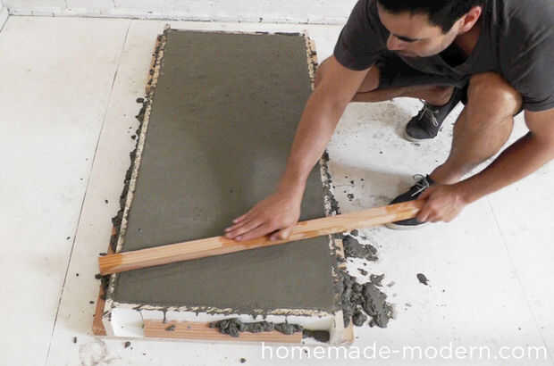 Asegúrese de que el concreto húmedo es pack abajo en cada esquina y la forma de vibrar. Usé un trozo de madera como una subbase para nivelar el hormigón.