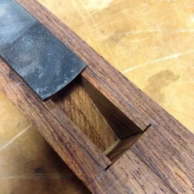 Para guiar el serrucho perfectamente a las líneas de diseño es muy útil para cortar un pequeño hombro para los dientes del Serrucho a montar contra al comenzar el corte. Para hacer este hombro, corte por la línea de diseño cuidadosamente con un cuchillo afilado y una regla. Corte suavemente al principio, y profundizar la línea de corte con pases adicionales y más presión. Luego use un formón para quitar la madera desde el lado inútil del corte. VI ambos cortes con cuidado y lentamente hasta el 3/8" profundidad intentando su mejor para alojarte square. Esto es infinitamente más fácil con las piezas en un tornillo de banco.