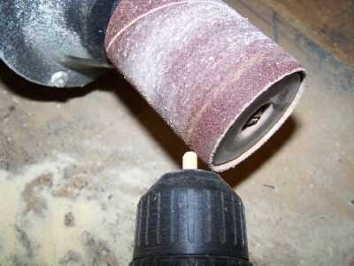 Corta pernos de pasador de 1/4 de pulgada 1 1/4 pulgadas de largo.  Necesitas cuatro piezas de espiga.  En la foto me han instalado mi tambor de lijar en mi sierra de brazo radial y han puesto un taco en un mandril.  Cuando ambos apuntan a que es fácil hacer un ligero chaflán en cada extremo de cada pasador.  Esto hace más fácil para los tacos se deslice en los agujeros de los rompecabezas.