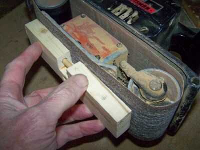Incluso después de raspar lejos exceso de pegamento en el paso 12 allí puede ser algunos bordes irregulares a lo largo de la articulación de pegamento o algunas manchas de pegamento. Use una lijadora de banda, como la lijadora de correa se muestra a continuación, para eliminar las irregularidades. También usar un papel de lija para redondear los bordes cuadrados de las dos mitades. Si desea aplicar un acabado, utilice un acabado de aceite o una mancha. Mi amigo alemán simplemente dejó su inacabado. Un barniz hará tolerancias más pequeñas y podría entrar en los orificios para taquetes donde pueden pegar los tacos en el interior de los agujeros.