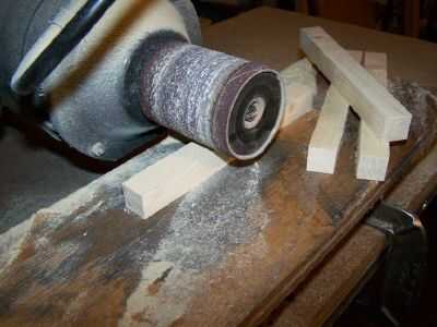 Estoy usando un tambor de lijar en mi sierra de brazo radial y una pequeña mesa que eleva el nivel de trabajo para mayor comodidad para hacer las piezas exactamente cuadradas y libres de marcas de los dientes de sierra.  La dimensión final no es crítica, pero será un poco menos de 3/4 de pulgada terminada.