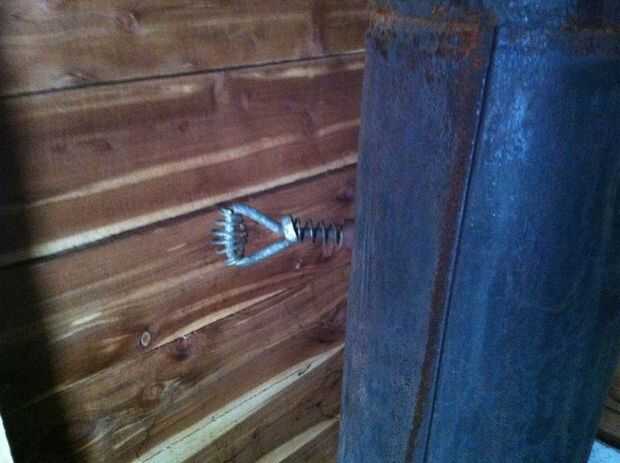 Tuve un lío todo de plástico, láminas de proyectos anteriores y utilizando una grapadora creó una barrera de vapor/viento en el interior del marco. Me encontré con 3 hojas de tablero de aislamiento de espuma de poliestireno y cortar para que quepa entre los postes de madera en todas las paredes y el techo que en la zona donde el tubo de la estufa.