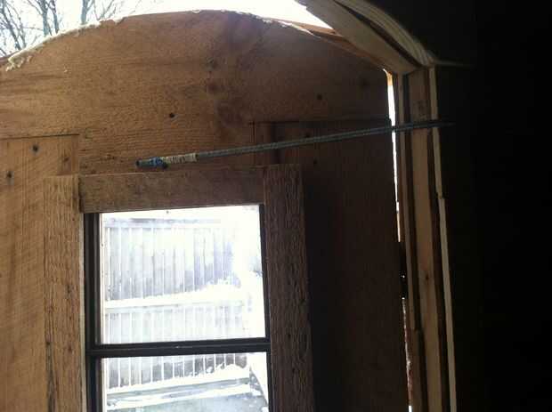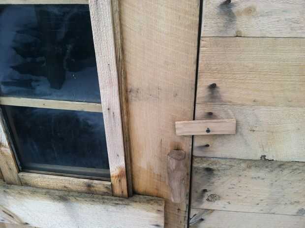 La puerta fue hecha desde la izquierda sobre tablas de pino que ya tenían la vuelta de la nave en ellas y una ventana ~ 100 año de edad que he encontrado en el ático que era de cuando se construyó la casa de mis padres. Quería hacer una puerta curva, pero debe de Plaza sólo se quedaron ha sido más fácil...