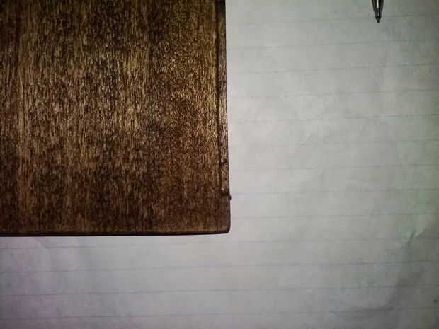 La parte superior fue cortada del mismo modo, pero no a lo largo de un borde corto y sólo hasta 3/8" desde el extremo. [imagen 4] Esto permite que la tapa se deslice en su lugar, pero no muestra la muesca cuando está cerrado.